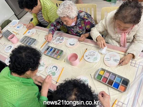 타일에는 노인들이 합창하는 모습을 비롯해 어르신들을 응원하는 메시지 등이 담겼다. 어르신과 어린이들이 함께 만든 타일은 신기경로당 입구에 벽화로 만들어져 지역 주민들이 함께 감상할 수 있도록 했다.
