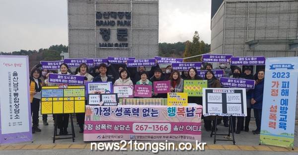 (뉴스21통신/최원영기자)=울산 남구(구청장 서동욱)와 남구통합상담소는 여성폭력 추방 주간(11월25일~12월1일)을 맞아 성폭력·가정폭력에 대한 경각심을 일깨우기 위해 29일 울산 대공원 일대에서 성폭력·가정폭력 추방 홍보활동을 펼쳤다.