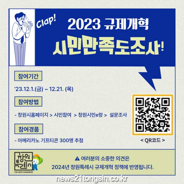 창원특례시 규제개혁 시민만족도 조사는 시 홈페이지 ‘2023년 규제개혁 시민만족도 조사’ 배너 클릭 또는 ‘시민참여>창원시민e랑>설문조사’ 게시판에서 창원시민, 관내기업 관계자 등 누구나 참여할 수 있으며, 참여 독려를 위해 설문응답자 중 추첨을 통해 약 300명에게 경품(모바일 커피 쿠폰)이 지급할 예정이다.