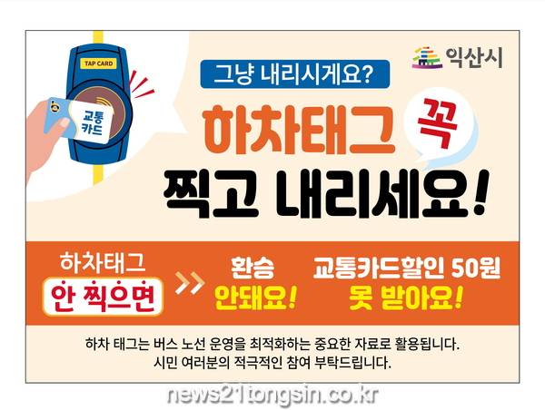 30일 익산시에 따르면 ‘하차 태그’는 버스 승객이 교통카드로 시내버스를 탈 때 버스 앞 승차 단말기에 교통카드를 대 요금을 결제하듯, 내릴 때 내리는 문 앞에 달린 하차 단말기에 교통카드를 대는 것을 말한다.