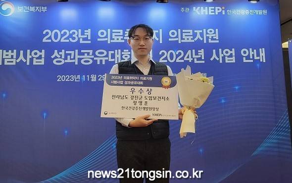 강진군은 지난 29일, 서울에서 개최된 ‘2023년 의료취약지 의료지원 시범사업 성과대회’ 개인 부문에서 도암보건지소 정영훈 공중보건의사가 우수상(한국건강증진개발원장상)을 수상했다고 밝혔다.