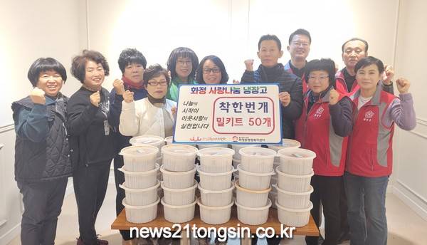 (뉴스21통신/임정훈기자) = 울산 동구 화정동 주민 친목단체 ‘착한번개모임’이 12월 1일 오전 10시 30분 화정동 행정복지센터를 방문해 ‘화정 사랑나눔 냉장고’에 반찬 밀키트 50개를 기부했다.