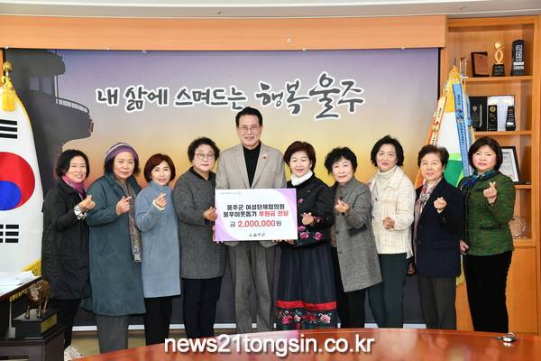 (뉴스21통신/우정석기자) = 울주군 여성단체협의회(회장 이경화)가 6일 군청 군수실에서 울주군 저소득 지원을 위한 후원금 200만원을 전달했다.