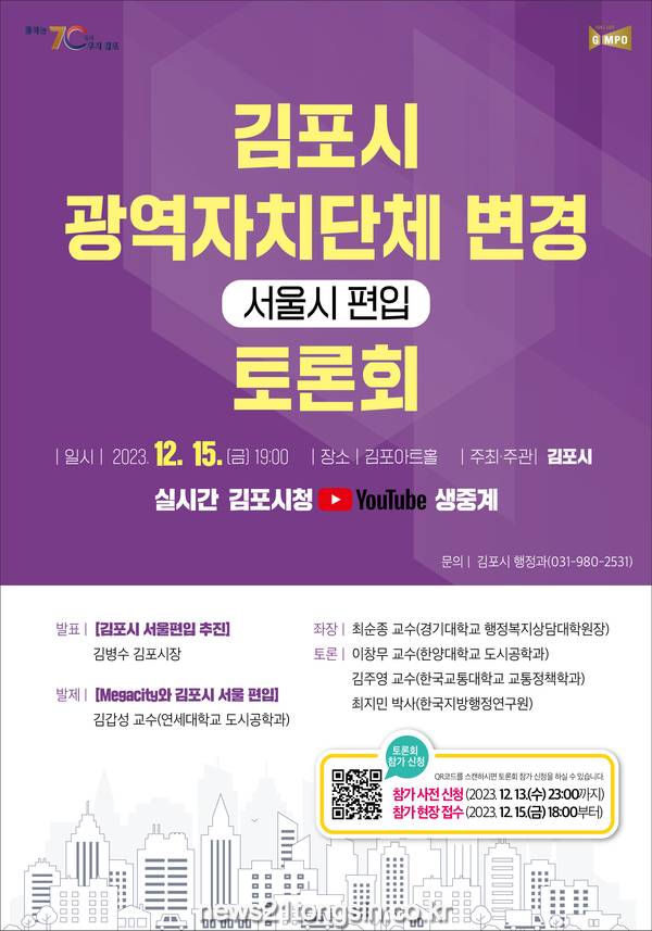 이번 토론회는 김포시청 Youtube로 온라인 생중계될 예정이다. 토론회 참석을 원하는 사람은 누구든지 김포시 홈페이지를 통해 13일 23시까지 사전신청하면 되고, 토론회 당일에도 김포아트홀 2층에서 신청할 수도 있다. 문의는 김포시 행정과 031-980-2531로 하면 된다.