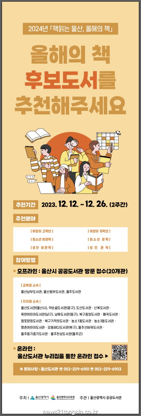 이번 시민 추천 도서 공모는 울산시민이면 누구나 가능하며 12월 12일부터 26일까지 공공도서관에 방문해 추천서를 직접 작성하거나 도서관 누리집(library.ulsan.go.kr)을 통해 온라인으로 추천하면 된다.
