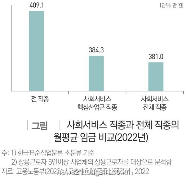 사회서비스 산업 전체 직종의 월평균 임금은 381만원이고, 핵심 산업군 직종은 384만3000원으로 전 직종 월평균 임금(409만1000원)과의 격차가 큰 것으로 나타났다.