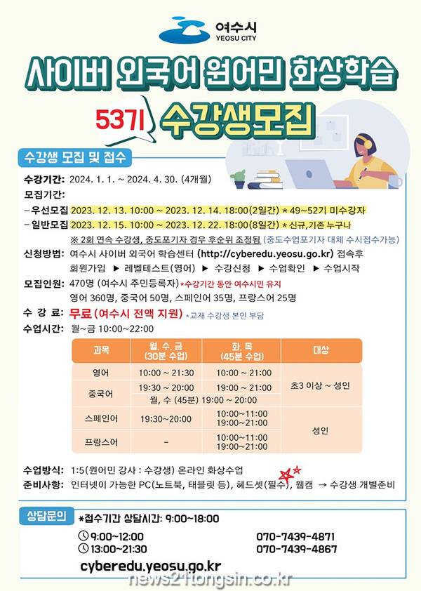 53기 원어민 화상학습은 2024년 1월 1일부터 4월 30일까지 영어, 중국어, 스페인어, 프랑스어 등 4개 외국어로 운영되며 수강료는 무료다.