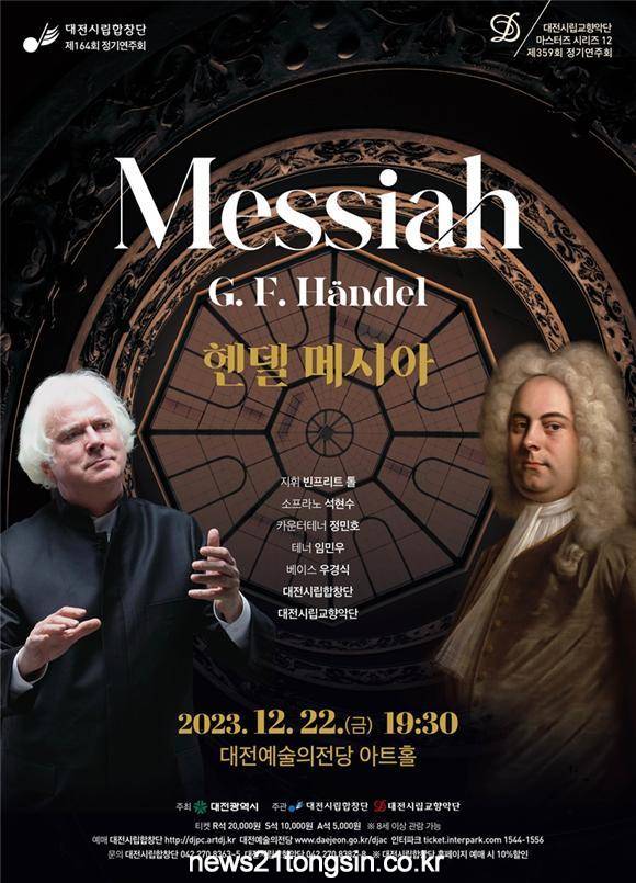 대전시립합창단과 대전시립교향악단이 공동 주관하는 2023년 마지막 공연 <헨델 메시아>가 22일 오후 7시 30분 대전예술의전당 아트홀에서 펼쳐진다.