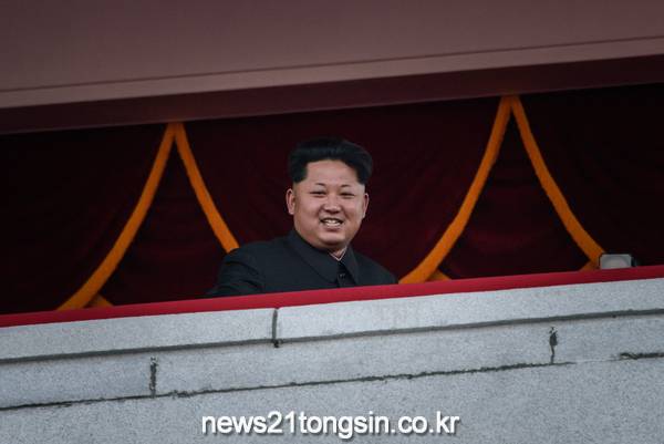 지난해 10월 김일성 광장에서 열병식을 내려다보고 있는 김정은 위원장.