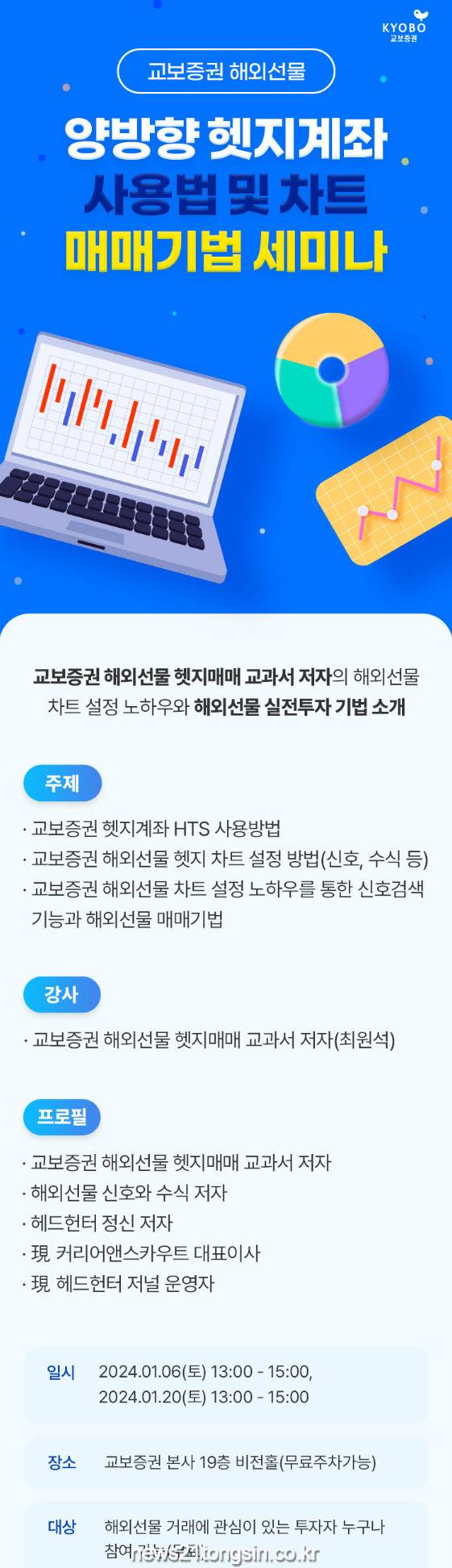 교보증권은 2024년 1월 6일과 20일 각각 오후 1시부터 3시까지 여의도 본사(여의도역 4번 출구) 19층 비전홀에서 해외선물 양방향 헷지에 대한 주제로 투자 세미나를 개최한다.