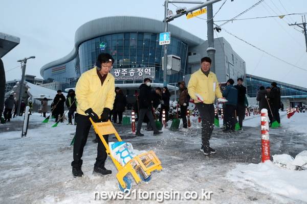 [뉴스21통신/장병기 기자] 광산구 전 직원 제설작업 1광주 광산구가 대설특보 발효에 따라 21일 오전 7시부터 전 직원 제설작업 등 시민 안전과 불편 최소화를 위한 총력 대응에 나섰다.