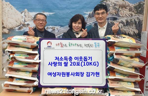 (뉴스21통신/임정훈기자) = 울산 동구 일산동 여성자원봉사회 김가현 회장은 12월 20일 오후 2시 일산동행정복지센터에서 저소득가정 20가구에 쌀을 기탁했다.