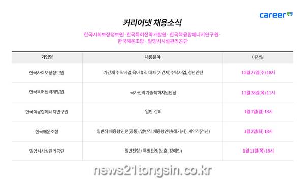 한국해운조합에서 일반직 채용연계형 인턴 및 계약직(전산) 채용을 진행한다. 채용 분야는 △일반직 채용형인턴(공통) △일반직 채용형인턴(해기사) △계약직(전산)으로 채용 인원은 총 11명이다. 자세한 지원 자격 및 우대 사항 등은 홈페이지를 통해 확인할 수 있다. 전형 절차는 서류전형, 필기전형, 면접전형, 신체검사를 거쳐 최종 합격자를 발표할 예정이다. 지원서는 1월 2일(화) 18시까지 채용 홈페이지를 통해 온라인 접수하면 된다.