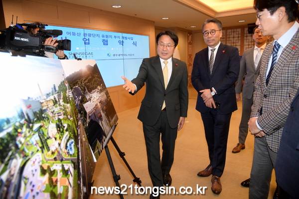 광주광역시(강기정 시장)는 22일 시청 비즈니스룸에서 광주광역시도시공사와 ㈜신세계프라퍼티가 어등산관광단지 유원지 부지개발을 담은 ‘어등산관광단지 유원지부지 개발사업 사업협약’을 체결했다.