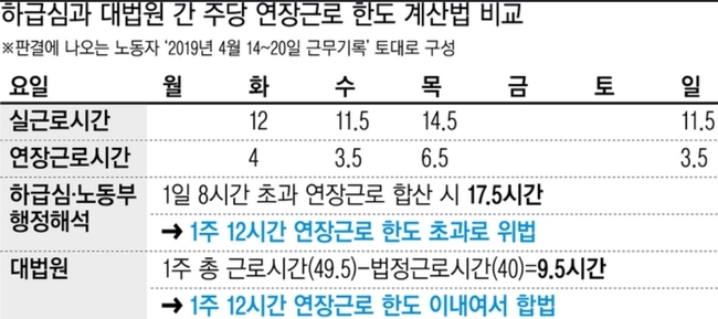하지만 대법원의 판단은 달랐다. 주당 총근로시간이 52시간을 넘지 않으면 된다는 후자의 계산방식을 택한 것이다. 대법원은 “하루 8시간을 초과하는 연장근로시간의 1주간 합계에 관한 규정은 없다”면서 “1주간의 연장근로가 12시간을 초과했는지는 1주간의 근로시간 중 40시간을 초과하는 근로시간을 기준으로 판단해야 한다”고 했다.