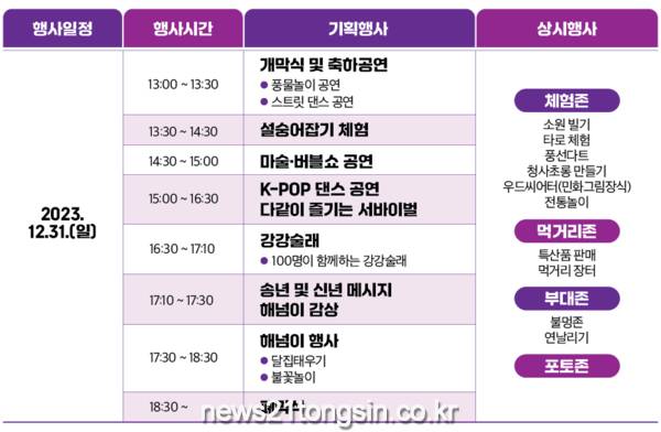 강강술래, 해넘이 감상, 달집태우기, 불꽃놀이 등이 펼쳐져 가족, 친구, 연인 등 남녀노소 모두에게 2023년을 추억하고 2024년 갑진년의 새해 희망을 다짐하는 의미 있는 시간이 될 수 있을 것이다.
