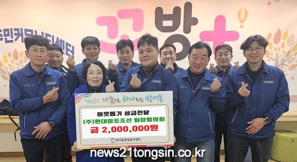 (뉴스21통신/임정훈기자) = ㈜현대미포조선 팀장협의회(회장 김지석)는 12월 22일 방어진행정복지센터에 어려운 이웃을 위해 사용해달라며 성금 200만원을 전달했다.