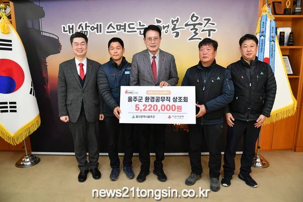 (뉴스21통신/우정석기자) = 울주군 환경공무직 상조회가 27일 울주군청에서 이순걸 울주군수, 권혁록 환경공무직 노동조합 울주군 지부장, 김정구 울주군 환경공무직 상조회 회장 등이 참석한 가운데 울주군 지역 취약계층 지원을 위한 성금 552만원을 전달했다.