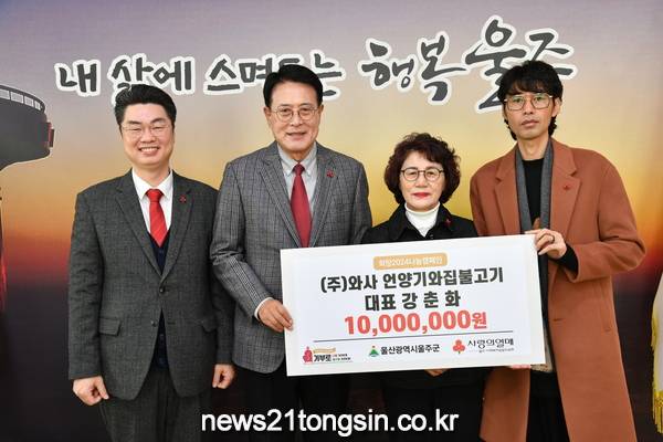 (뉴스21통신/우정석기자) = ㈜와사 언양기와집불고기(대표 강춘화)가 27일 울주군청 군수실에서 이순걸 군수를 비롯한 관계자들이 참석한 가운데 저소득 세대를 위한 성금 1천만원을 전달했다.