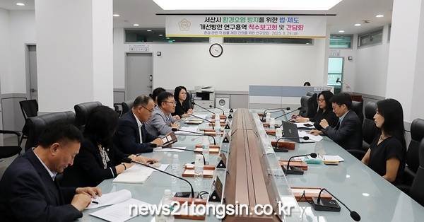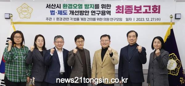 서산시의회 환경 관련 각 법률 개정을 위한 연구모임(대표 문수기 의원)은 2023년 12월 27일(수) 의회 정책간담회장에서「서산시 환경오염 방지를 위한 법* 제도 개선 방안 연구용역」 최종보고회를 개최했다.