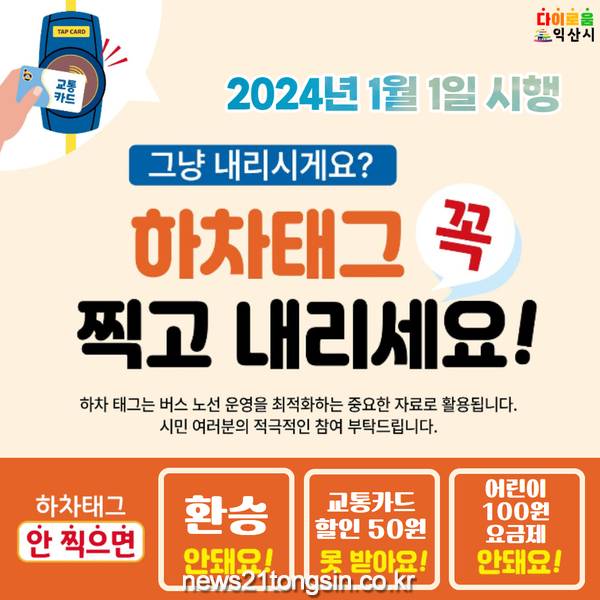 한편 시내버스 하차 시 주의해야할 점이 있는데, 2024.1.1.부터 하차태그 의무제가 함께 시행됨에 따라 하차 시 반드시 하차단말기에 교통카드를 찍고 내려야(하차태그) 다음 승차 때 100원 요금이 적용된다.