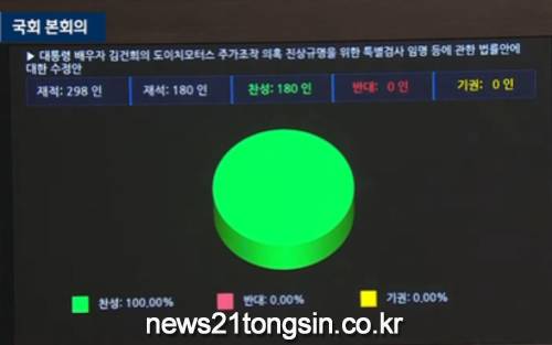 이어 '대통령 배우자 김건희의 도이치모터스 주가조작 의혹 진상규명을 위한 특별검사 임명 등에 관한 법률안'을 표결에 부쳐 재석 180명 전원 찬성으로 통과시켰다.