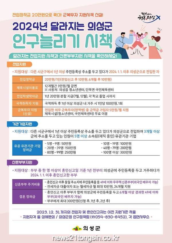 한편, 2024년 달라지는 인구늘리기 시책은 해당 읍·면사무소에서 신청할 수 있으며, 자세한 내용은 의성군청 홈페이지 공지사항 게시판을 통해 확인할 수 있다.