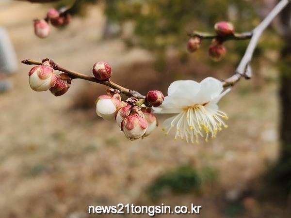 찬바람 속에서도 매화의 진한 향은 뚜렷하게 느껴며, 활동이 줄어든 꿀벌 한 마리도 이 향기를 따라 꽃송이 사이를 분주하게 날아다니는 모습이 포착되었다.