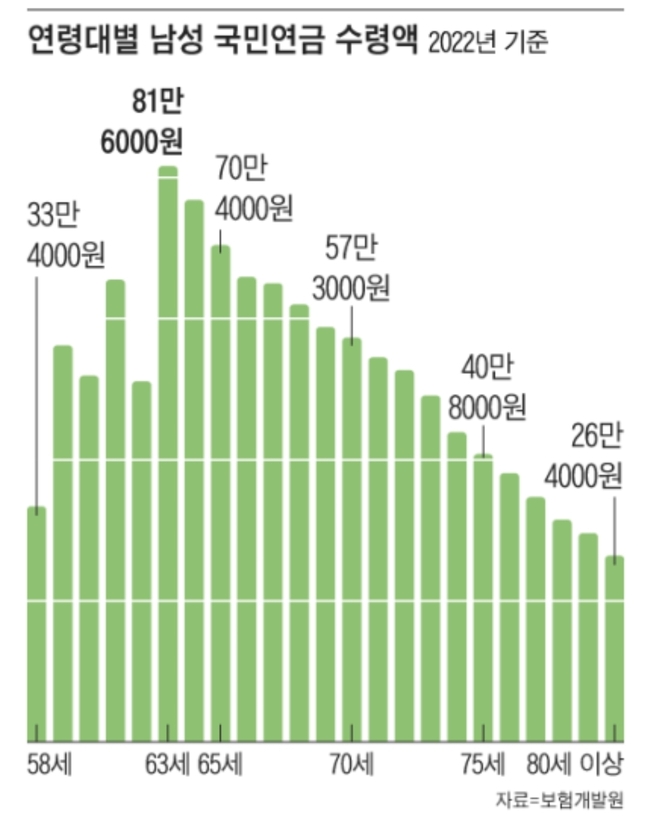 59년생의 연금액이 가장 많은 건 왜일까. 김동엽 미래에셋 투자와연금센터 상무는 “국민연금을 많이 받으려면 가입 기간이 길어야 하는데, 59년 돼지띠들은 20대 후반에 국민연금 제도가 시작됐다”면서 “이 세대는 연금 가입 기간이 30년 정도로 긴 데다 소득대체율이 70%였던 시기와 근무 기간도 겹치기 때문에 다른 연령대에 비해 연금액이 많은 것”이라고 말했다.