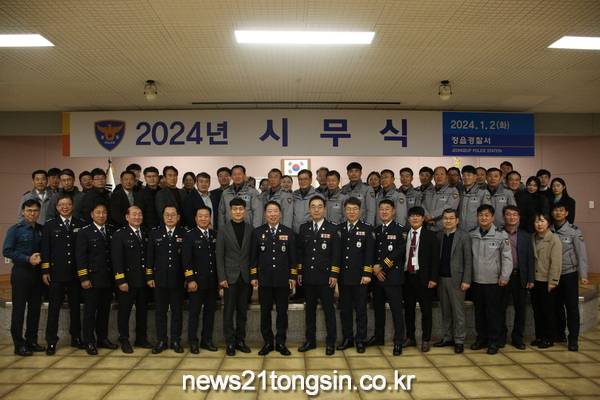 정읍경찰서(서장 김한곤)는 지난 2일 오전 3층 대회의실에서 경찰서장, 각 과장, 지역관서장 등 경찰관이 참석한 가운데 2024년 시무식을 가졌다.