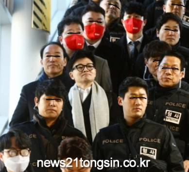 특히 한 위원장의 뒤로 빨간 마스크를 쓴 남성들의 모습이 눈에 띄었다. 이들은 한 위원장의 경호를 자처한 국민의힘 당원들이다.