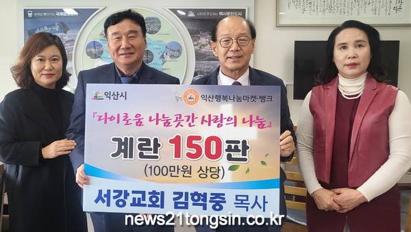 익산서강교회 김혁중 목사는 4일 익산시청을 방문해 다이로움 나눔곳간이용자를 위해 동물복지유정란 150판(100만원 상당)을 기탁했다.