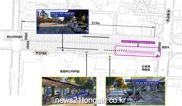 또 터미널 내부에서 진출하는 상당수의 차량이 동운고가 방면 좌회전 금지에도 불구하고 광천사거리로부터 90m 내 짧은 구간에서 5개 이상의 차로를 무리하게 변경하면서 불법으로 좌회전하고 있어 교통체증과 사고 위험성이 높은 지역이다.