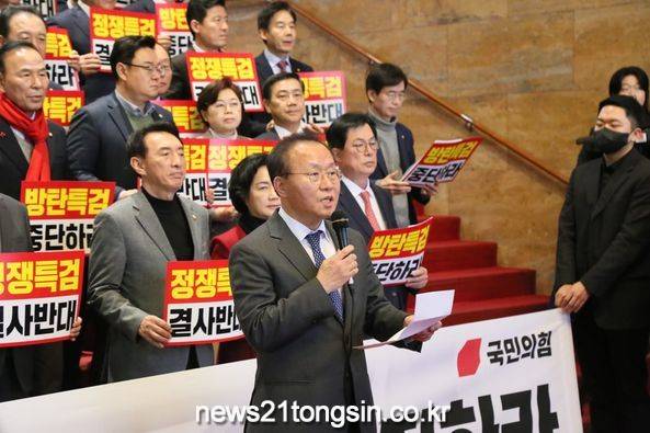 윤 원내대표는 오늘(9일) 의원총회에서 “여야가 합의를 하지 않았다는 이유로 (쌍특검법) 재표결을 상정 안 할 것이 아니다”라며 이 같이 밝혔다.