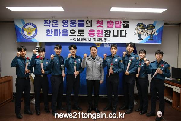 정읍경찰서(서장 김한곤)는 지난 8일 경찰서 2층 어울마당에서 제313기 신임경찰관 경장 김근호, 순경 김연화(여), 순경 백장현, 순경 신의준, 순경 이윤수, 순경 전준영, 순경 정시우, 순경 황건하 총 8명을 따뜻한 마음으로 맞이하는 환영식을 가졌다.