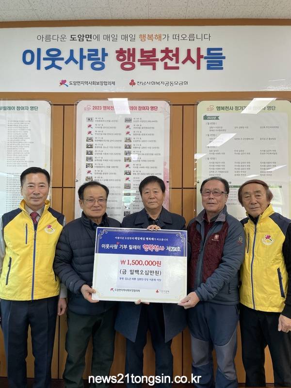 [뉴스21통신 박찬웅 기자] 강진군 도암면(면장 윤치성)에서는 행복천사 기부 릴레이가 지역민들의 열띤 참여 속에서 꾸준하게 이어지고 있다.