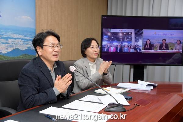 ▲ CES 2024 광주공동관 개관식[뉴스21통신/장병기 기자] 세계 최대 가전‧정보기술(IT) 전시회 ‘CES 2024’의 개막에 맞춰 10일 미국 라스베이거스 현지에서 광주공동관이 문을 열었다. 강기정 광주광역시장은 개관식에 온라인으로 참가했다.