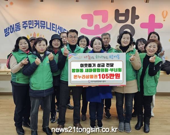 (뉴스21통신/임정훈기자) = 울산 동구 방어동 새마을협의회(회장 윤만석)·부녀회(회장 김정숙)는 1월 10일 방어동행정복지센터를 방문해 어려운 이웃들을 위해 써 달라며 온누리 상품권 105만원을 전달했다.