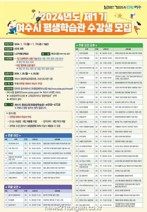 오는 29일부터 4월 20일까지 과목별 25명의 정원으로 운영되며, 교육비는 무료이나 과목별 재료비는 학습자가 부담해야 한다.