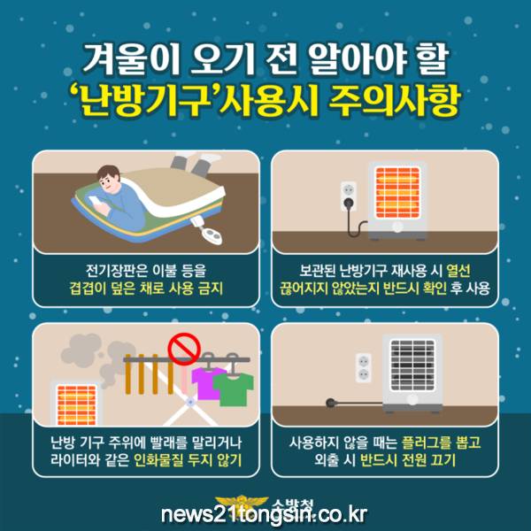 겨울철 3대 난방용품은 전기히터, 전기장판, 전기열선보일러를 말하며, 날씨가 추워질수록 더 많이 사용되고 있으나 아주 작은 부주의에도 큰 인명 및 재산 피해를 입을 수 있어 주의가 필요하다.
