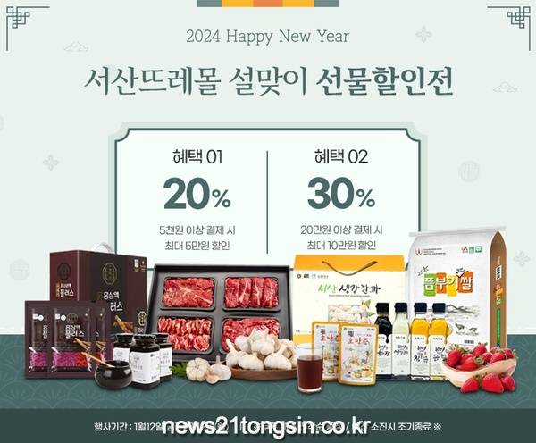 ▲ 서산뜨레몰 온라인 특판전 홍보물충남 서산시는 설 명절을 맞아 선물용품과 제수로 인기가 높은 지역 농특산물을 시중보다 저렴한 가격에 구매할 수 있는 온라인 특판전을 오는 2월 8일까지 운영한다고 밝혔다.
