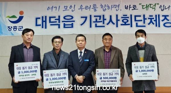 장흥군 대덕읍지역사회보장협의체읍장 이영철과 공동위원장 김영택이 추진하는 기부릴레이 운동에 11일 대덕읍 기관사회단체와 대표가 따뜻한 마음을 전달하였다.