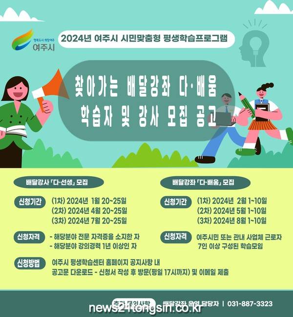 여주시 평생교육과에서는 평생학습 사각지대 주민의 학습권 보장과 시·공간 제약 없는 시민 맞춤형 평생학습 프로그램을 제공하고자 찾아가는 배달강좌 다·배움 학습자 및 배달강사 다·선생을 모집한다.