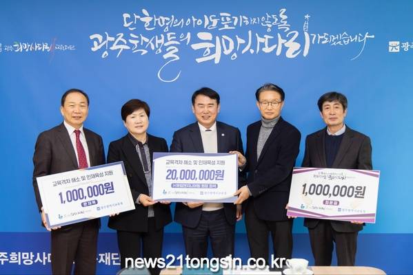 [뉴스21통신/장병기 기자] 광주희망사다리교육재단이 17일 유탑엔지니어링 최석 회장 등 지역인사들로부터 2,200만원의 기부금을 전달받았다.
