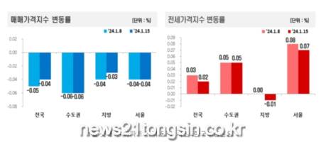 1월 셋째 주 전국 주간 아파트 전세가격은 0.02% 오르면서 전주(0.03%) 대비 상승 폭이 축소됐다. 수도권은 0.05%의 상승 폭을 유지했지만, 서울은 0.07%를 기록하며 전주 대비 0.01%포인트 낮아졌고 지방은 0.01% 하락으로 전환했다.
