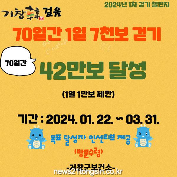 이번 1분기 챌린지는 1월 22일부터 3월 31일까지 70일간 진행되며 하루에 7천보씩 총 42만보 걷기를 도전하고 목표 달성 시 거창사랑상품권 5,000원을 지급한다.