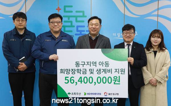 (뉴스21통신/임정훈기자) = HD현대중공업 김원탁 전무는 18일 동구청을 방문해 관내 어려운세대 장학금과 생계비를 지원해달라며 성금 5,540만원을 김종훈 동구청장에게 전달하였다.