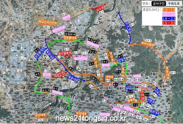 이날 회의에서는 도시철도 2호선 2단계와 호남고속도로 확장공사에 따른 교통변화 시뮬레이션 분석결과를 바탕으로 우회가능도로 25개 도로, 중점관리구간 29개 도로 69개 구간에 대한 교통방안을 점검했다.