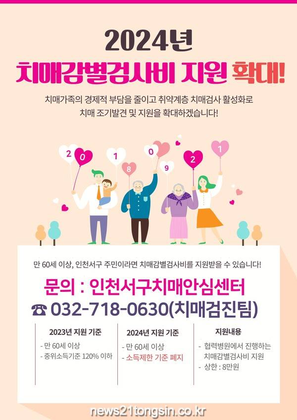 인천서구치매안심센터는 그동안 비용 부담으로 치매감별검사를 미뤄왔던 구민들을 위해 기존 중위소득 기준을 없애고 올해부터는 소득기준없이 모든 서구주민들에게 검사비를 돕는다.