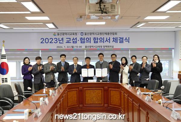 22일에는 정책회의실에서 천창수 교육감과 신원태 울산교총 회장 등이 참석한 가운데 ‘2023년 교섭·협의 합의서 체결식’을 열었다.